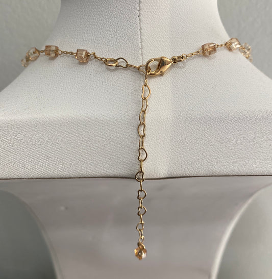 18K Gold-Plated Rosary Chain Necklace – Amber Colored Square Beads, Heart-Link Extension Chain
