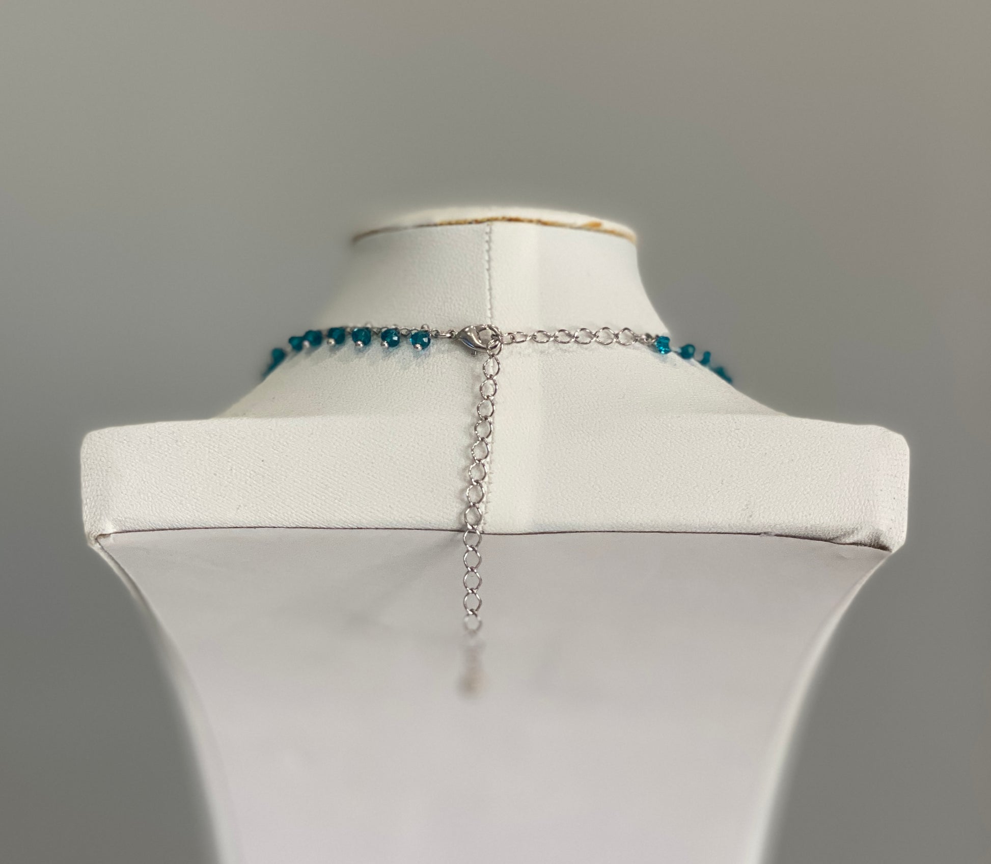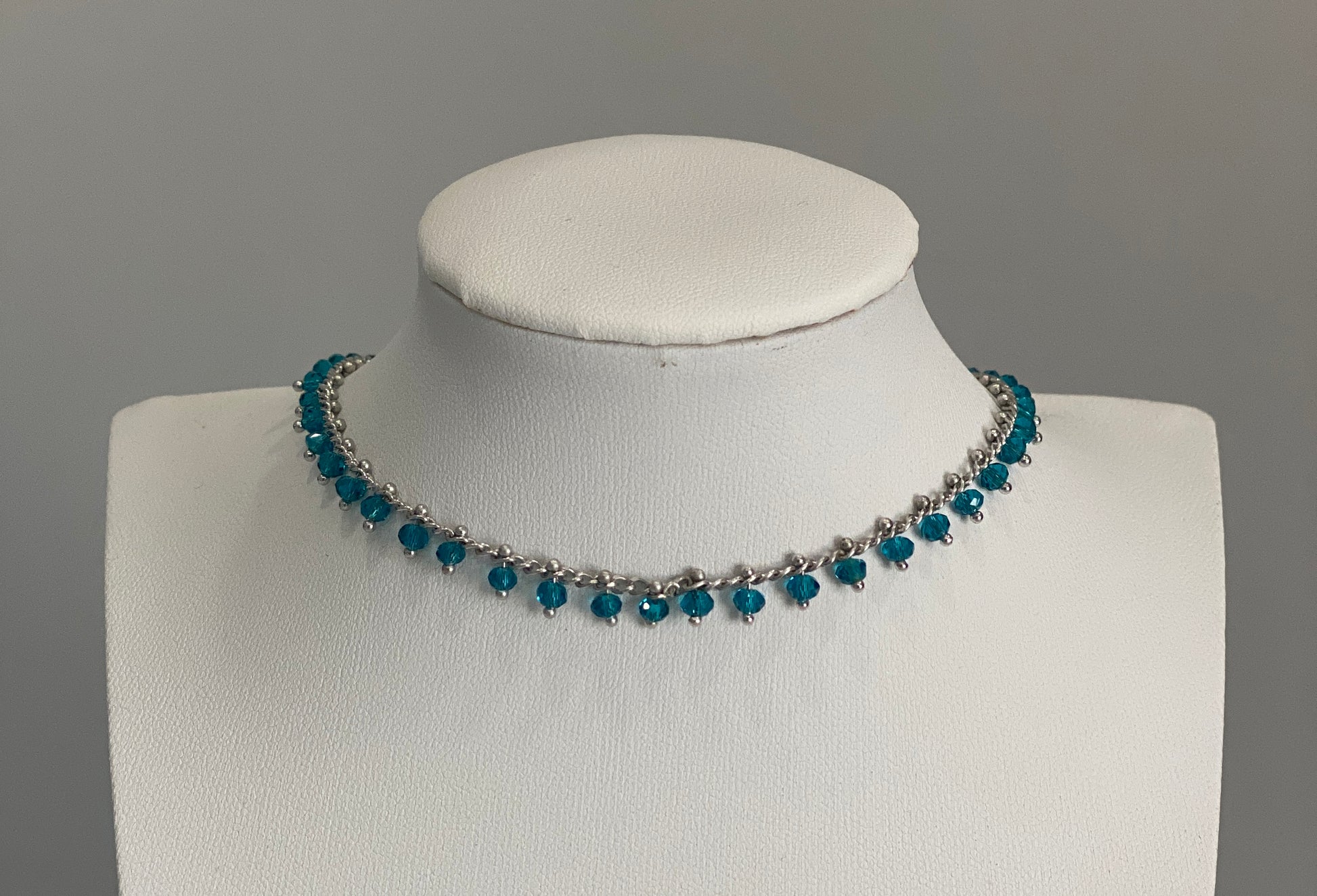 Elevate your elegance with the Aqua Radiance Choker, a shimmering piece crafted with a high-quality rhodium chain and links and dazzling aqua-colored bicones bead crystals. The slick design sits gracefully at the base of the neck, catching the light with every movement. Measuring approximately 12.5 inches in length and with an additional 3.5 inches of chain extension, to offer a comfortable and adjustable fit. Perfect for adding a refined sparkle to both everyday wear and special occasions.