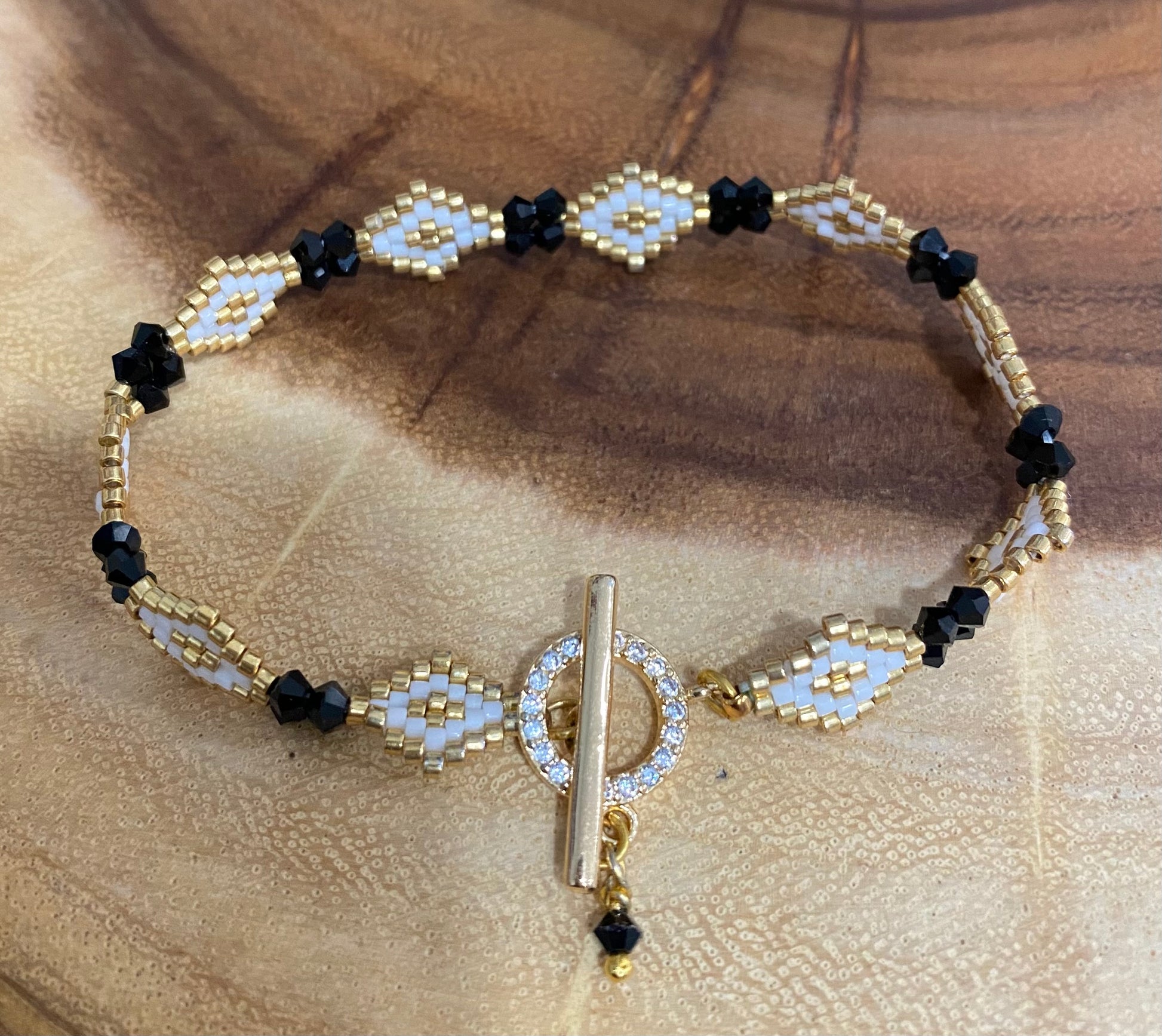 This elegant bracelet features Miyuki beads and Czech crystals intricately woven together, and culminating in a dazzling accessory. Completed with a sparkling toggle clasp, it adds a touch of sophistication to the beautiful piece.