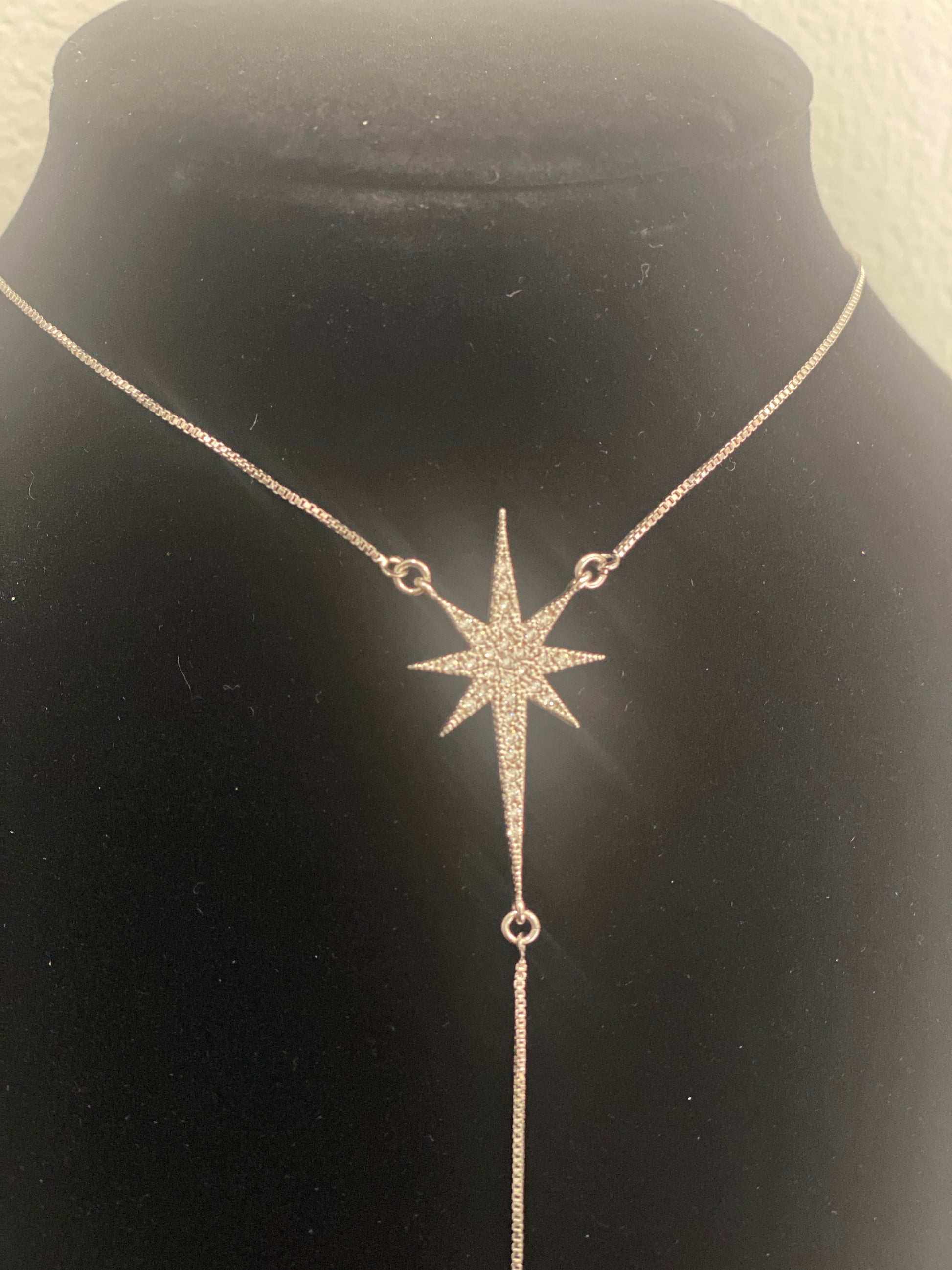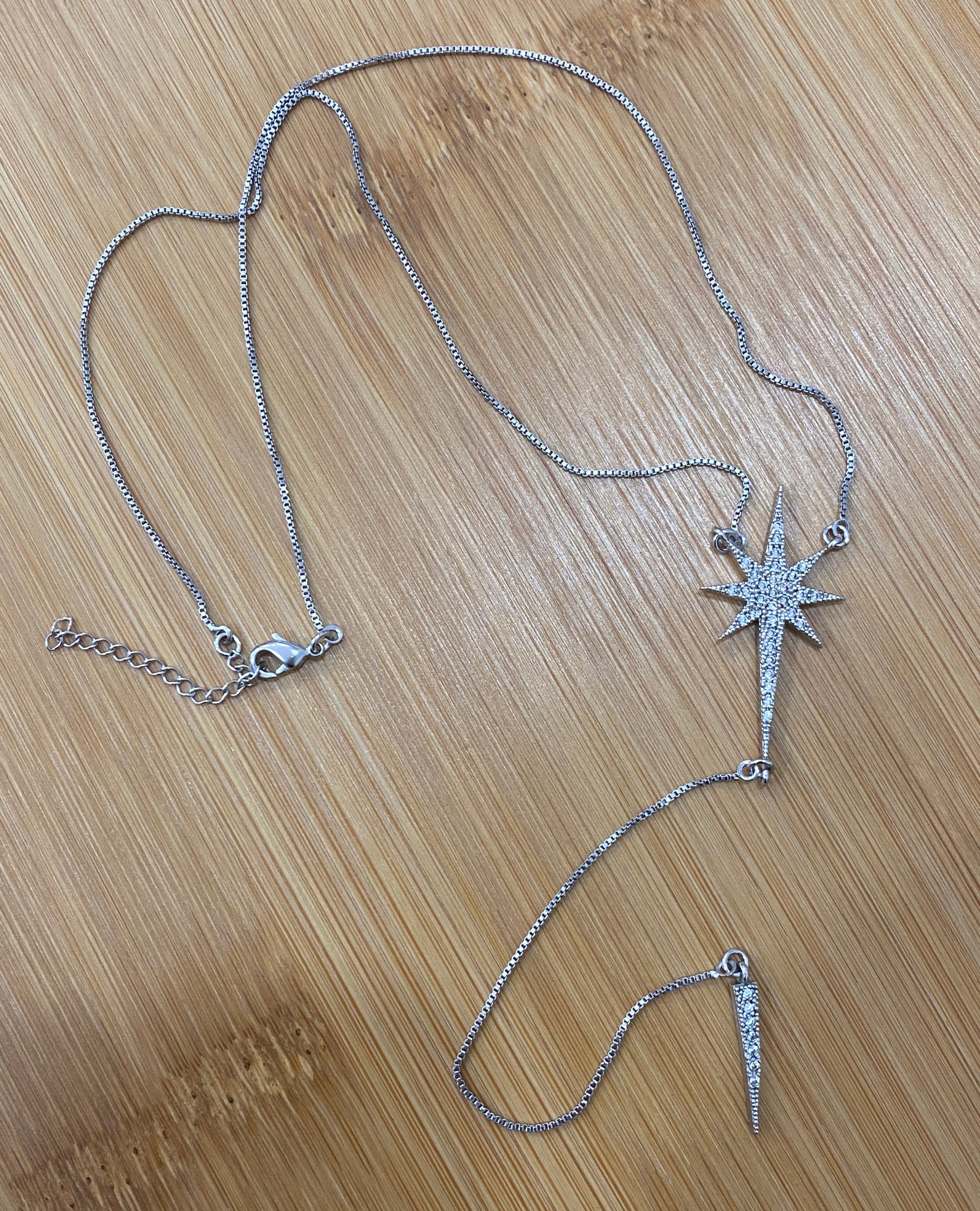 Make a celestial statement with this captivating rhodium-plated necklace, featuring a delicate 16-inch box chain with a 1.5-inch extender for adjustable length. At the heart of the design is a polished rhodium star, micro-pavé set with clear cubic zirconia for a subtle sparkle. From the pointy end of the star flows a 4-inch box link chain, ending in a striking rhodium spike, also adorned with dazzling CZ stones. Lightweight yet bold, this piece adds a modern, edgy twist to classic sparkle—perfect for layering or wearing solo as a standout accessory.