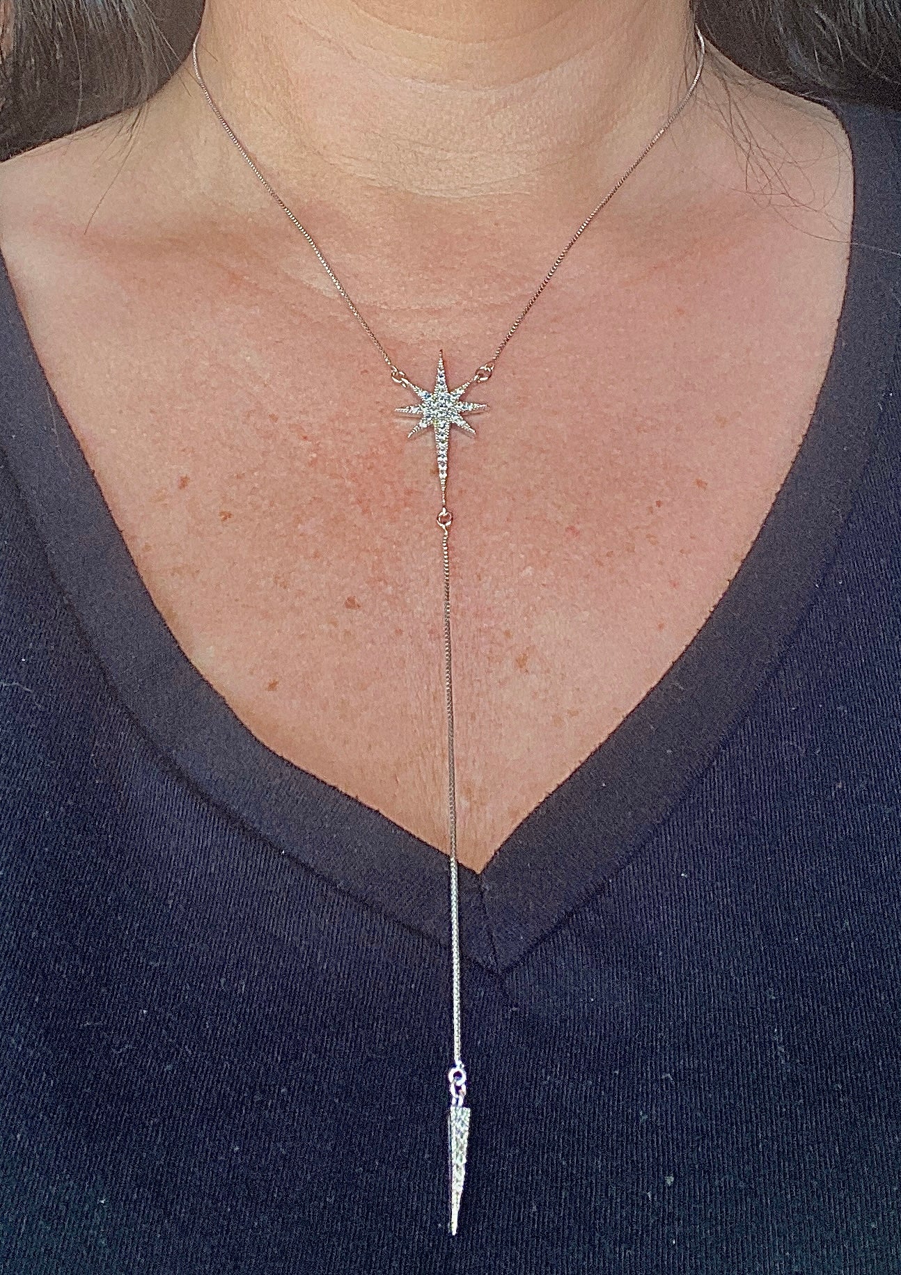 16" Rhodium Star Pendant Necklace with CZ Accents & Dangling Spike. Dainty Celestial Necklace.