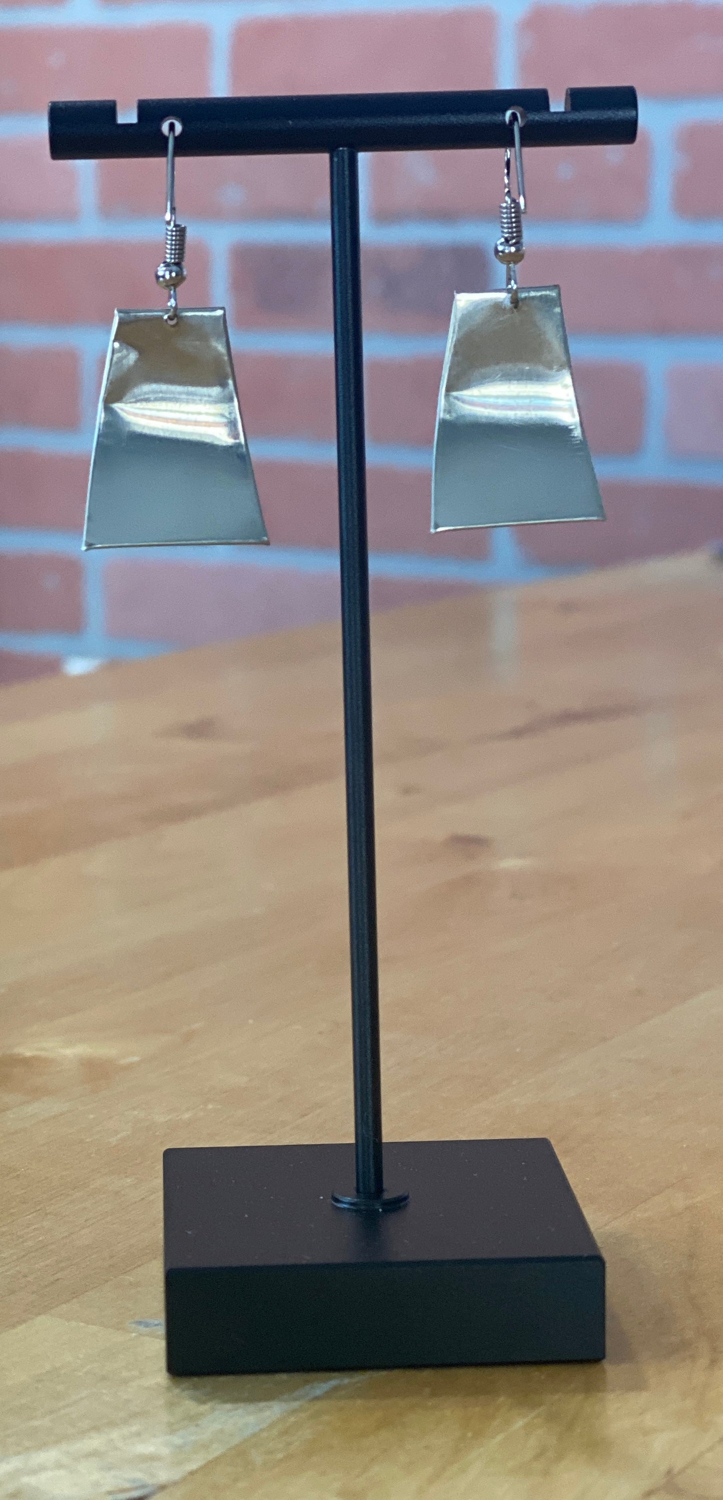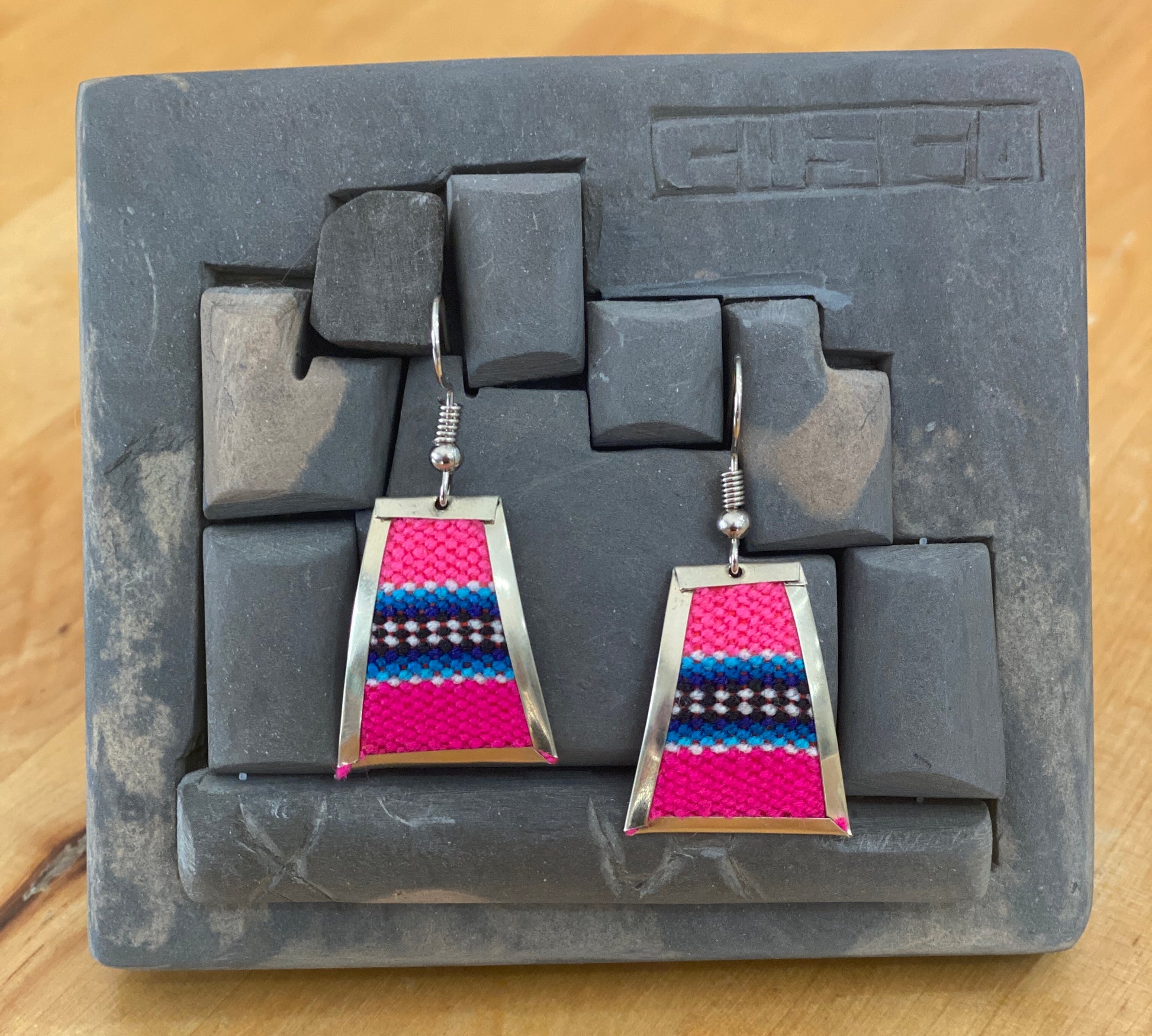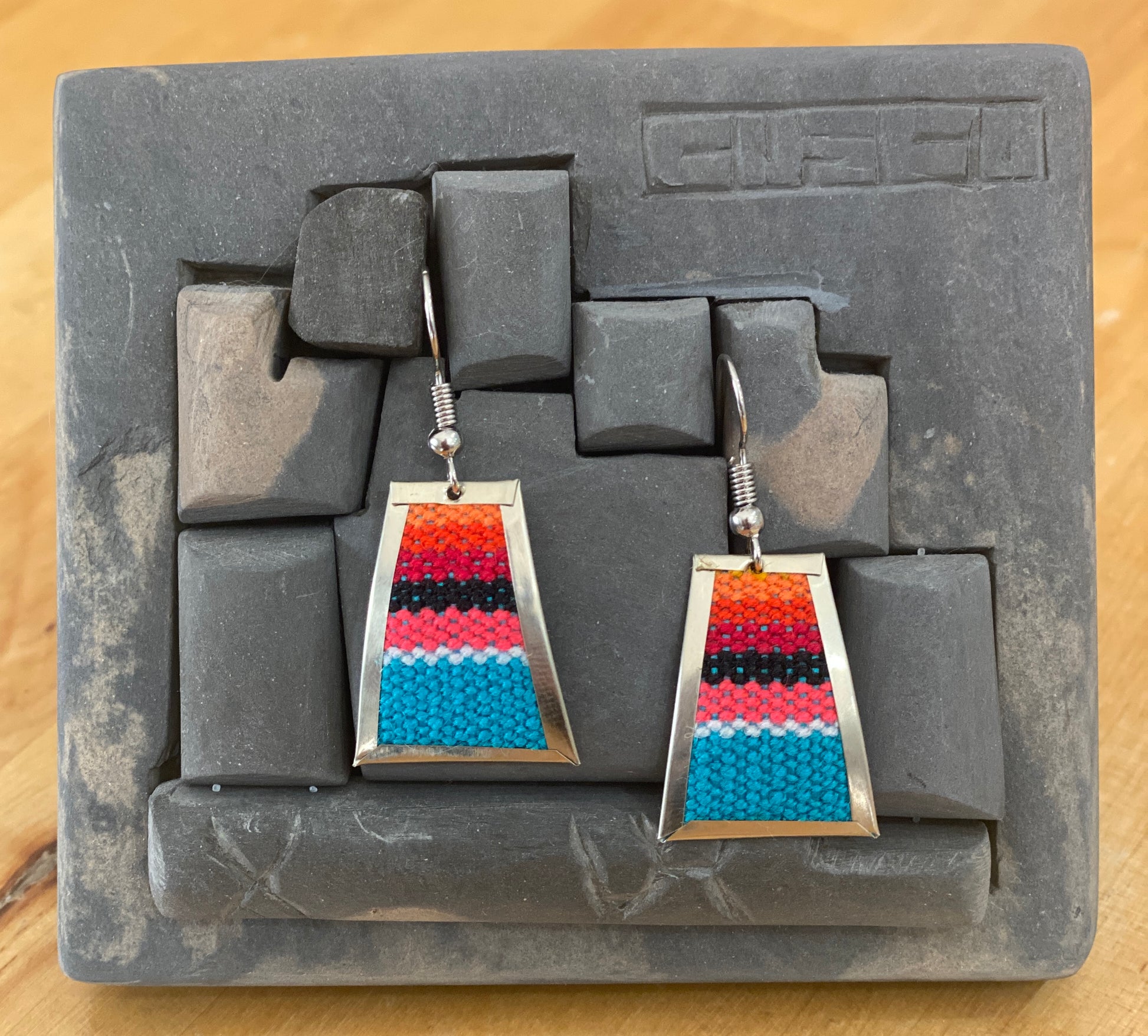 These handcrafted rectangular dangle earrings are a bold celebration of Inka culture and Andean craftsmanship. Made in Cusco, Peru, each piece features a vibrant handwoven textile showcasing traditional Inka patterns, carefully encased in a polished frame of Peruvian alpaca silver. The back is finished with a thin sheet of alpaca silver for a smooth and lightweight feel, and the steel hooks provide durability and secure wear. If you want me to replace the steel hook for sterling silver one, please don't forget to add it to your cart.