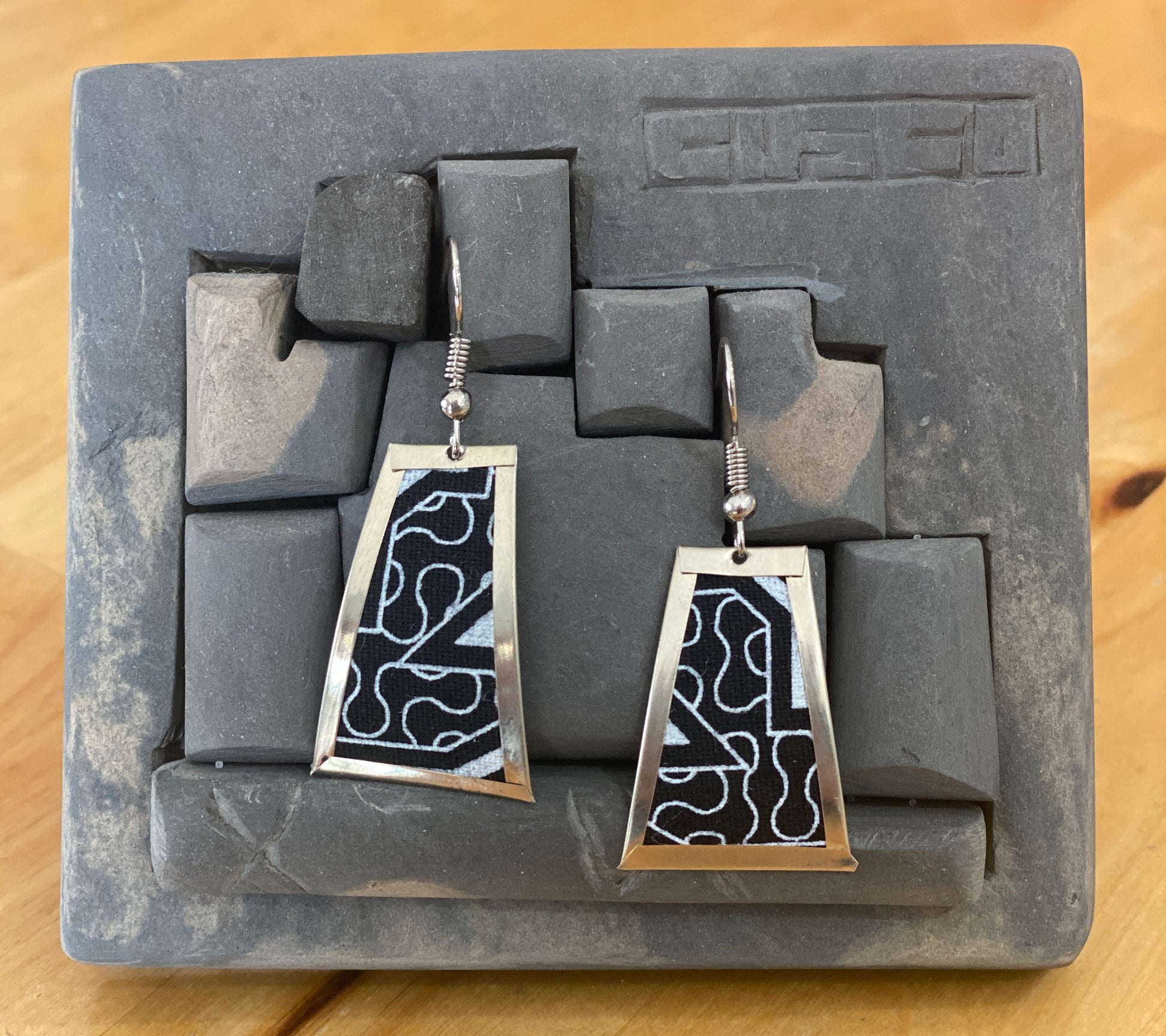 These handmade trapezoid dangle earrings blend Andean tradition with minimalist style. Crafted in Cusco, Peru, each pair features a black and white printed fabric with classic Inka-inspired designs, framed in a delicate border of Peruvian alpaca silver. The back is a smooth alpaca silver sheet, offering a polished finish, and the steel hook adds durability and ease of wear. If you want me to replace the steel hook for the sterling silver one, please don't forget to add it to your cart.